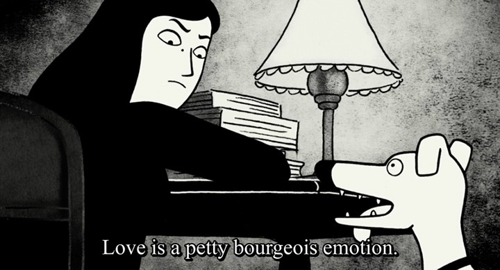 Upon her first major love, Marji unconsciously puts on rose-colored glasses. Harp music plays in the background, we see lovely scenes of nature, walks in the park, innocent flirtation and idealizing, until that is, she finds him in bed with someone else. Post break-up, her memories start to comically change, recalling instead the not-so-pretty reality of her first boyfriend. He takes on a more cowardly personality, suddenly has acne and an endless supply of mucus and hides behind Marji during difficult situations. The deeper truth shown here is that first love is often romanticized. But the realization of her relationship’s beatification is done in a humorous fashion.